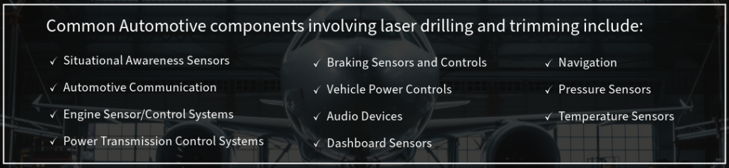 Electronic components are increasingly common in automobiles, with modern vehicles having more than 200 electronic control units, many of which contain sensors and processor circuits that require fabrication and calibration through laser drilling and resistor trimming. Unique considerations for automotive component manufacturers include environmental improvements, safety enhancements as well as convenience and comfort.