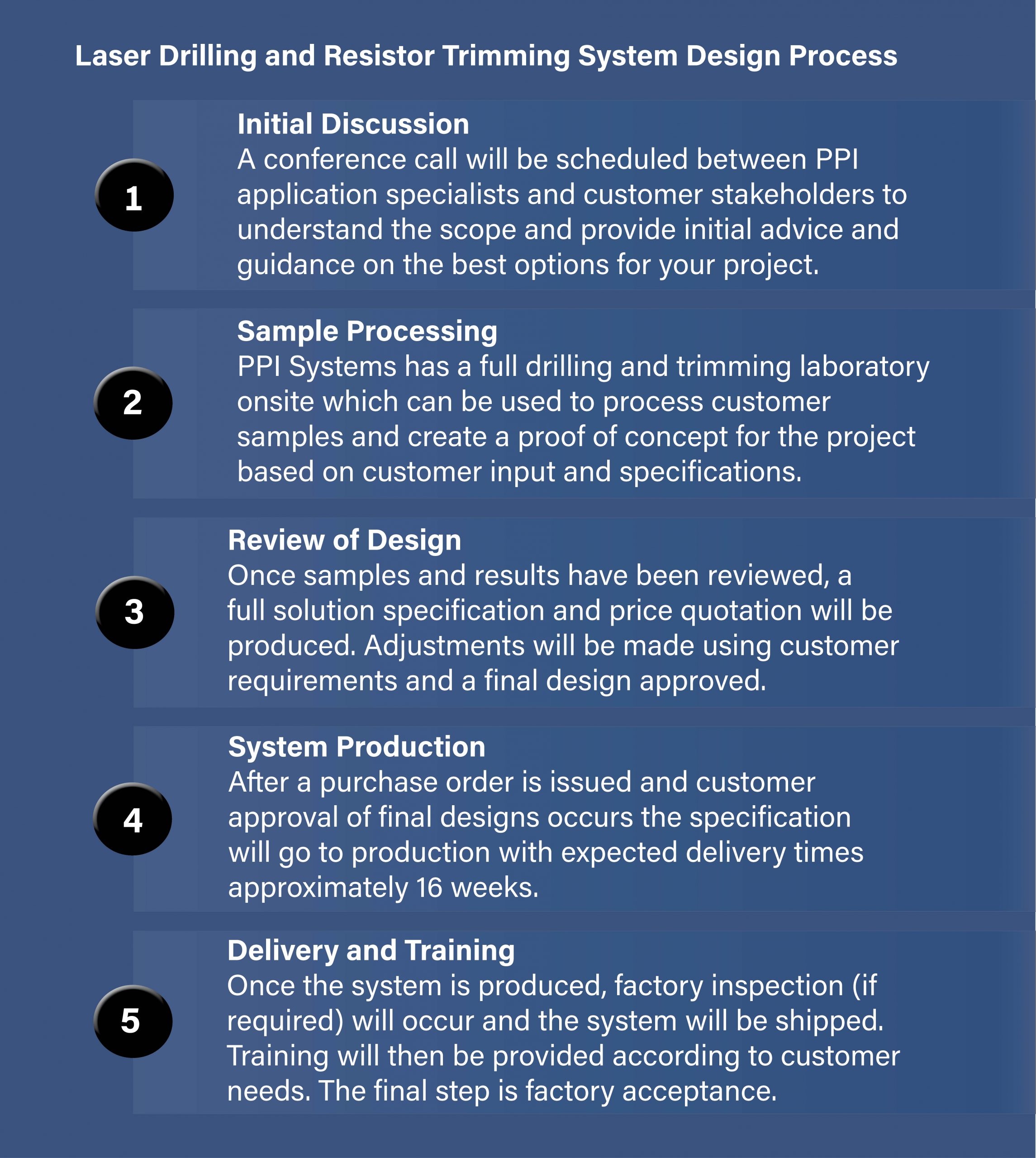 PPI Systems application engineers are experts in handling resistor trimming and via drilling samples in our laser processing systems. Their tasks includes carrying out feasibility studies on customer materials and supporting our sales teams in demonstrations and application tests. Specialists work tirelessly to find the optimal laser parameters for a wide variety of materials, developing new applications and processing samples of materials to ensure PPI processing systems provide optimal results.