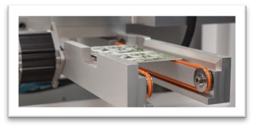 An in-line conveyorized substrate transport is another available configuration. This would use the same SMEMA-compatible hardware as the magazine loader, just without the magazine loading / unloading modules. Substrates are passed to the RapiTrim directly on the conveyor track and picked-and-placed by the robot onto the vacuum chuck (or another fixture if necessary). As with the magazine loader configuration, full line integration is achieved by following SMEMA standards, and the transport controls are fully integrated into the RapiTrim user interface.