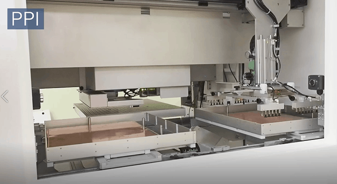 Demonstration of a tray removal and reload in a ProVia FP-UC dual CO2 and UV laser drilling system.