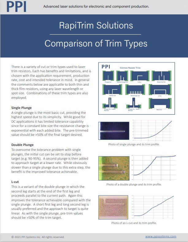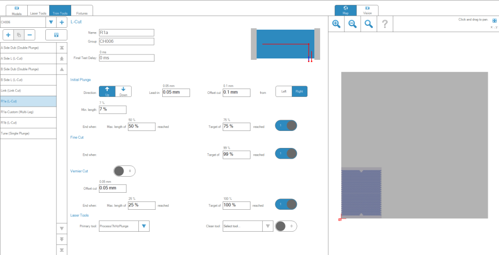 - Complete flexibility with single-plunge, double-plunge, L, vernier, scan, serpentine and custom multi-leg cut trims with settable cut length limits