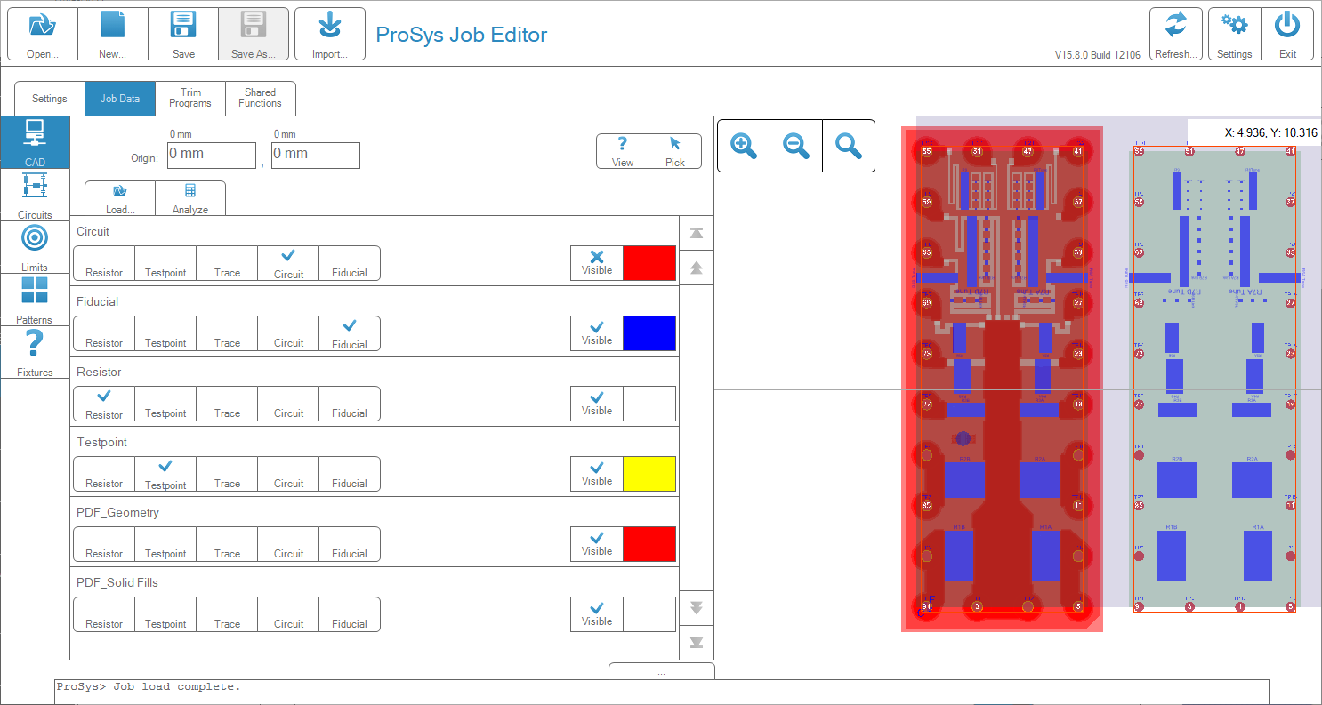 Job creation is through an interactive graphical map of components, circuit features, alignment targets, and trims. Extensive DXF and IPC-D-356 file import support automates and speeds job creation.