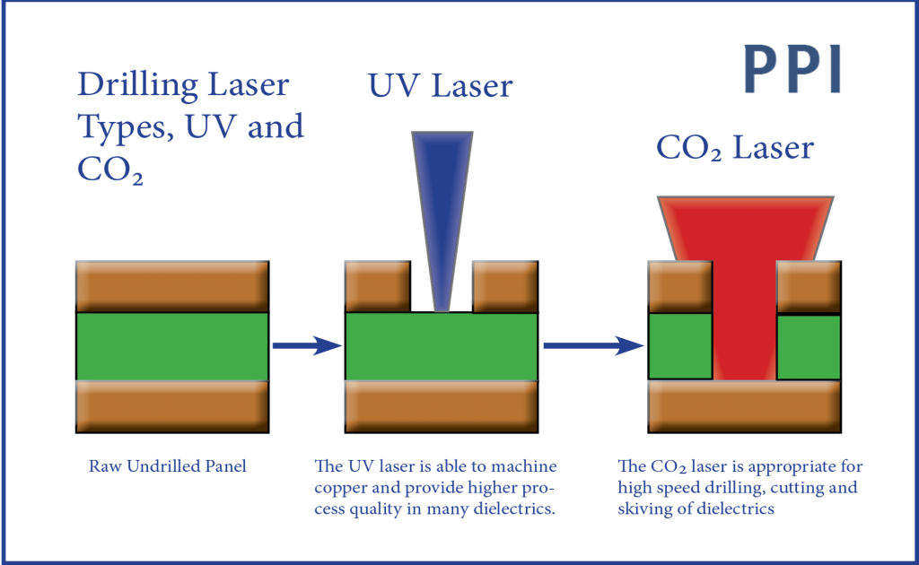 The UV laser operates at 355nm and can be used to machine not only copper but also dielectrics (with some caveats mentioned below). The prime use of the CO2 laser (mid-infrared wavelength) is to remove dielectric material, but in certain circumstances it can be used to also punch through copper. Using both lasers in the same machine allows the greatest process versatility to address the wide range of materials in use today.