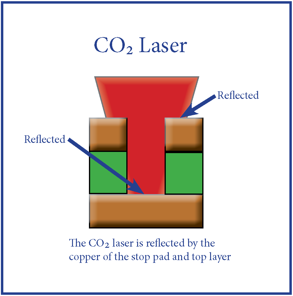 The mid-infrared wavelength of the CO2 laser is strongly absorbed by common dielectric materials and strongly reflected by copper. As a result a large CO2 spot can over-fill an opening in the copper (created by a UV laser or chemically etched) without risk of damage to the top layer of copper surrounding the hole (the capture pad). Repeated pulses will ablate the dielectric (including woven glass reinforcement) and the process self-terminates on the stop layer (target pad) as the beam again is reflected by the copper. A standard desmear has commonly been used for plating preparation.