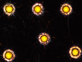 The CO2 spot size is larger than the UV, and a zoom telescope in the ProVia FP-UC models allows any diameter from 80-200µm to be selected. Typically the 200µm spot is used to flood expose vias up to 150µm diameter as shown in the adjacent figure. The laser dose is under user control through the laser repetition rate, pulse length, peak power (which along with the pulse length defines the pulse energy), and number of pulses (in punch mode) or pulse overlap (if spiraling for larger holes).