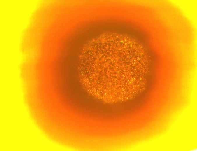 Bottom of microvia after standard hybrid process showing clean but undamaged Cu layer