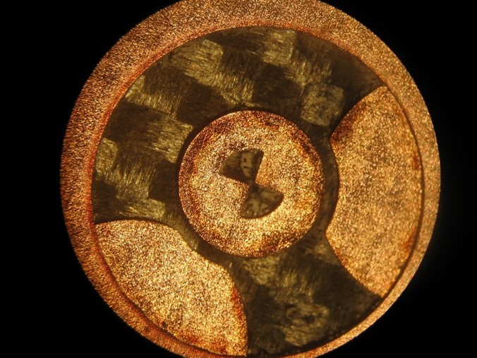 Buried fiducial exposed after standard UV and CO2 skiving, plus a UV cleaning pass to provide good contrast for the high mag alignment camera